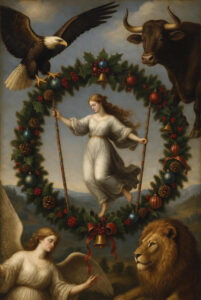Символізм: Жінка у святковому вбранні всередині великого різдвяного вінка, оточена символами чотирьох стихій. Це фінальна точка подорожі.