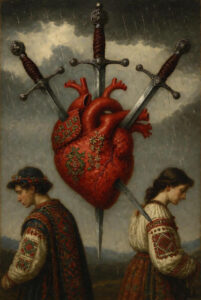 1. Старець-травник (Дідух/Знахар) Символізм: Передача знань, спадкоємність поколінь. Старець у вишиванці тримає папороть або лікарську рослину — символ мудрості та зв’язку з землею. Значення: Це карта Наставника. Вона говорить про коріння, сімейні традиції та навчання. Діти поруч символізують майбутнє, яке вбирає досвід минулого. 2. Колесо долі (Коловорот) Символізм: Неминучість змін, циклічність […]