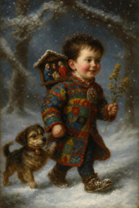 Символізм: Радість, невинність, свято. Дитина несе на спині макет Різдвяної стайні (вертеп).