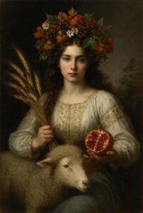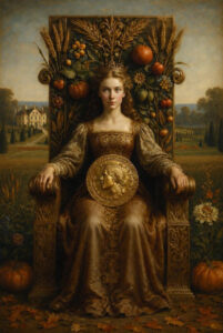 Символізм: Жінка на троні, прикрашеному колоссям, гарбузами та плодами. Вона тримає золотий диск із профілем.