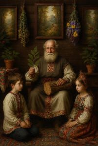 Символізм: Передача знань, спадкоємність поколінь. Старець у вишиванці тримає папороть або лікарську рослину — символ мудрості та зв’язку з землею.