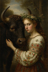 Символізм: Приборкання дикої сили, плодючість. Бик — символ чоловічої енергії та мощі, дівчина — ніжності та любові.