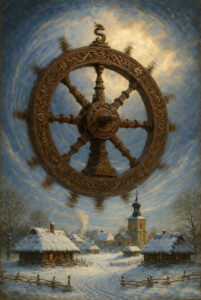 Символізм: Неминучість змін, циклічність часу. Дерев’яне колесо, що зависло над засніженим селом, нагадує язичницький символ сонця та вічного руху життя.