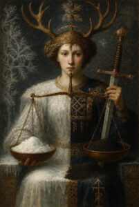 Символізм: Роги оленя символізують природну силу та зв’язок з лісом. Терези з білою та чорною речовиною (сіль та земля) — це вибір між добром і злом. Меч — неминучість покарання.