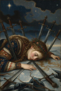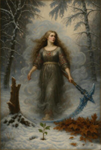 Символізм: Красива дівчина з крижаною косою в темних шатах серед засніженого лісу. Смерть тут виступає не як кінець, а як природний етап трансформації.
