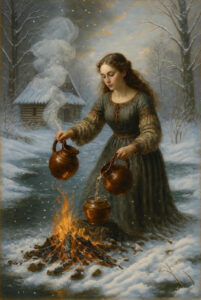 Значення: Це пошук духовного орієнтира. Розбитий лід під ногами символізує перехідний стан (від зими до весни або від дитинства до зрілості), а ідоли — зв’язок з минулим.