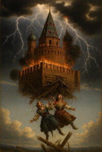 Символізм: Блискавка, що руйнує верхівку кам’яної споруди, та люди, що падають у прірву. Це символ раптового втручання зовнішніх сил, які неможливо контролювати.