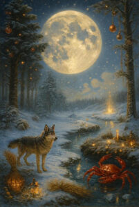 Символізм: Повня над водою, вовк, що виє, та рак, який виповзає на берег. Стежка між двома деревами веде в невідомість під холодним світлом.