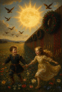 Символізм: Величезне золоте світило та діти, що біжать квітучим полем. Вінки на огорожі символізують циклічність часу та перемогу світла над темрявою.