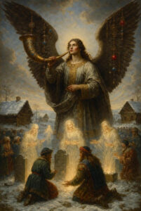 Символізм: Янгол із золотими крилами сурмить у ріг над засніженими могилами, закликаючи душі до пробудження.