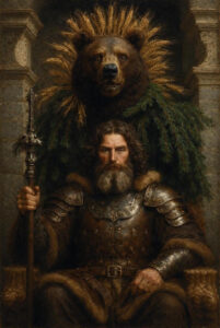 Значення: Символ влади, захисту та єдності з природою. Ведмідь — це тотемна тварина, дух предків. Пшениця в його короні символізує достаток, а похмурий воїн — невтомного вартового своєї землі.