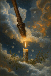 Значення: Божественне втручання або диво. Свічка — це людська душа чи віра, а посох у небі — символ вищої волі, що підтримує цей вогник у холодні часи.