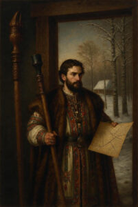 Символізм: Чоловік у багатому каптані тримає карту, стоячи в дверях. Поруч — величний посох.