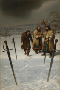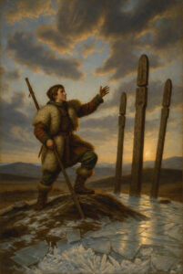 Символізм: Хлопець у традиційному хутряному вбранні стоїть на льоду, простягаючи руку до дерев’яних стовпів (ідолів) на фоні заходу сонця.