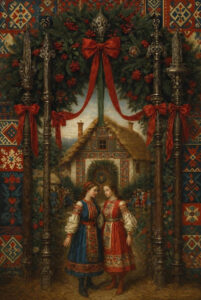 Символізм: Дві дівчини в етнічному одязі стоять під аркою з ялини та червоних стрічок на фоні традиційної хати.