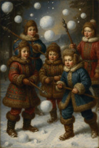 Символізм: Діти в теплих кожухах граються зі сніжками, що магічно зависли у повітрі.