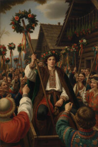 Символізм: Святкова процесія, юнак на возі з великим квітковим вінком на посоху.