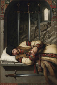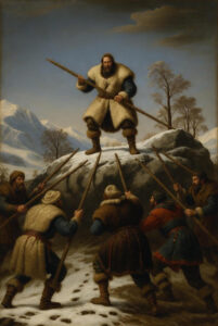 Символізм: Літній чоловік з пораненим чолом, за спиною якого височіє частокіл зі списів.