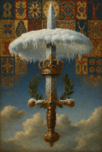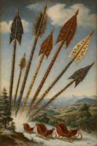 Символізм: Стріли, що злітають у небо з неймовірною швидкістю, прикрашені витонченими орнаментами та квітами. Порожні розкішні сани на передньому плані підкреслюють велич моменту.