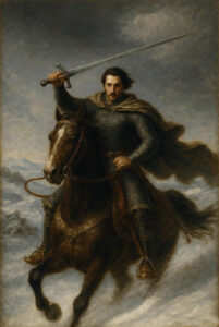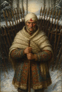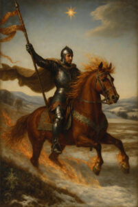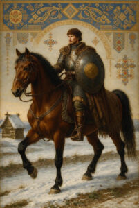 Символізм: Вершник у повному обладунку на тлі засніженого поля та традиційної хати. Круглий щит із золотим сонцем у центрі — символ захисту та сонячної енергії.