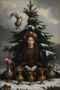 Символізм: Жінка у святковому вбранні всередині великого різдвяного вінка, оточена символами чотирьох стихій. Це фінальна точка подорожі.