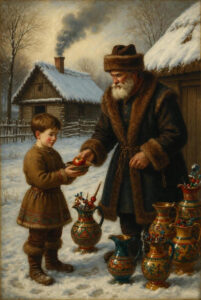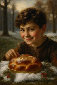 Символізм: Усміхнений юнак із веснянками тримає святковий калач (коровай) із золотою печаткою на снігу.