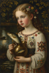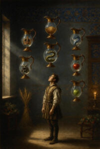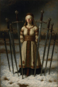 1. Старець-травник (Дідух/Знахар) Символізм: Передача знань, спадкоємність поколінь. Старець у вишиванці тримає папороть або лікарську рослину — символ мудрості та зв’язку з землею. Значення: Це карта Наставника. Вона говорить про коріння, сімейні традиції та навчання. Діти поруч символізують майбутнє, яке вбирає досвід минулого. 2. Колесо долі (Коловорот) Символізм: Неминучість змін, циклічність […]