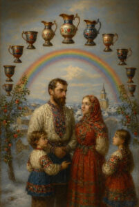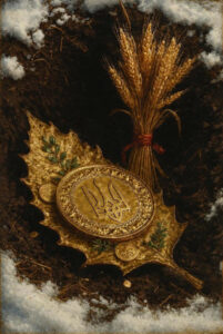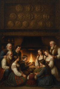 Символізм: Велика родина навколо багаття. Над ними — 12 золотих медальйонів (символи місяців або родових знаків). Вишиванки та світло вогню підкреслюють святість моменту.