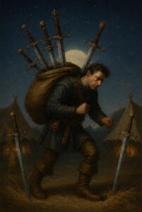 Значення: Досвід та непохитність. Поранення свідчить про пройдені випробування, а списи за спиною створюють образ незламної стіни та вічної варти.