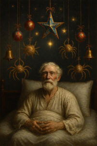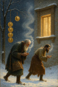 Символізм: Зимовий холод — період труднощів; тепле світло у вікні — надія; медальйони — ідоли або минулі авторитети, що спостерігають.