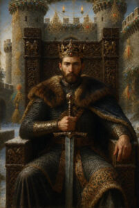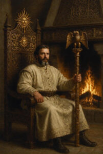Символізм: Чоловік на троні з символом сонця, що посміхається. У руці — жезл, увінчаний золотим орлом. За ним палає вогонь каміна.