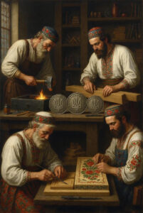 Чотири майстри працюють над деревом, металом та розписом, виготовляючи символи з тризубом.