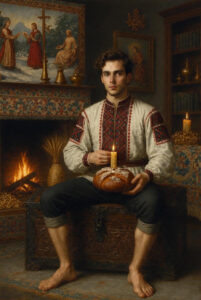 Юнак у вишиванці сидить на скрині, тримаючи хліб із запаленою свічкою.