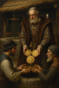 Старець у багатому вбранні тримає три великі золоті монети над руками двох прохачів.
