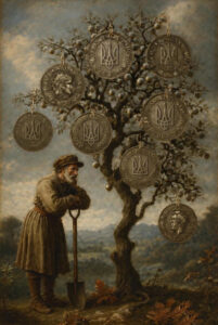 Селянин з лопатою відпочиває під деревом, на якому замість плодів ростуть величезні монети з тризубом.