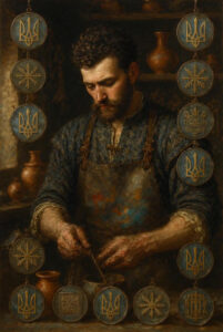 Майстер у фартуху працює над створенням медальйонів із тризубом та солярними знаками.