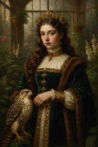 Шляхетна дівчина в оксамитовій сукні з соколом на руці в оточенні квітів.