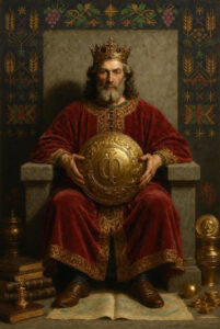 Символізм: Старша чоловіча постать у червоному (колір влади) тримає великий щит із символом, що нагадує монограму або сакральний знак. Біля ніг — карти та книги.