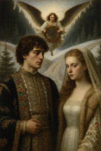 Символізм: Молода пара під крилами ангела, який тримає вінок. Сніжний шлях за ними розходиться у дві сторони, але вони стоять разом.