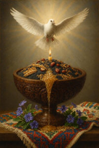 Символізм: Чаша з зерном, маком, медом та горіхами, над якою ширяє білий голуб (Святий Дух). Свічка та квіти барвінку навколо.