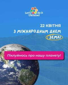 22 квітня відзначається Міжнародний день Землі, тож з приходом тепла та пробудженням природи всеукраїнський молодіжний рух «Let’s Do It Ukraine» закликає кожного громадянина свідомо ставитися до довкілля. Весняний період є ідеальним часом для відновлення чистоти в наших містах, парках та лісах. Екологічна відповідальність починається з малих справ, які під силу кожній людині.